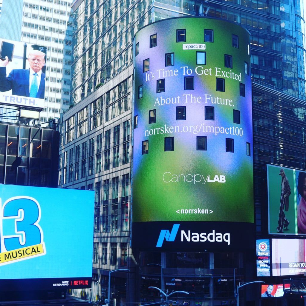 Og med hensyn til det sidste må jeg bare gøre opmærksom på noget næppe nogen dansk journalist kan fatte. CanopyLAB er som eneste danske startup sammen med 100 globale startups i ugen, ifølge fx TechCrunch, nomineret til ”Nobelprisen for bæredygtige startups”. Intet mindre end et forbillede i udlandet for originalitet og klasse! Prisen er opfundet af estimerede Norrsken Foundation, der blev stiftet med trecifret millionbeløb i ryggen af Niklas Adalberth der co-foundede Klarna – og de er helt oppe at køre over den ny Nobelpris oppe nord for os. CanopyLAB stod med kæmpe logo på den navnkundige Nasdaq-bygning i New York i ugen under den meget sigende rubrik fra Norrsken: It’s Time To Get Excited About The Future”.